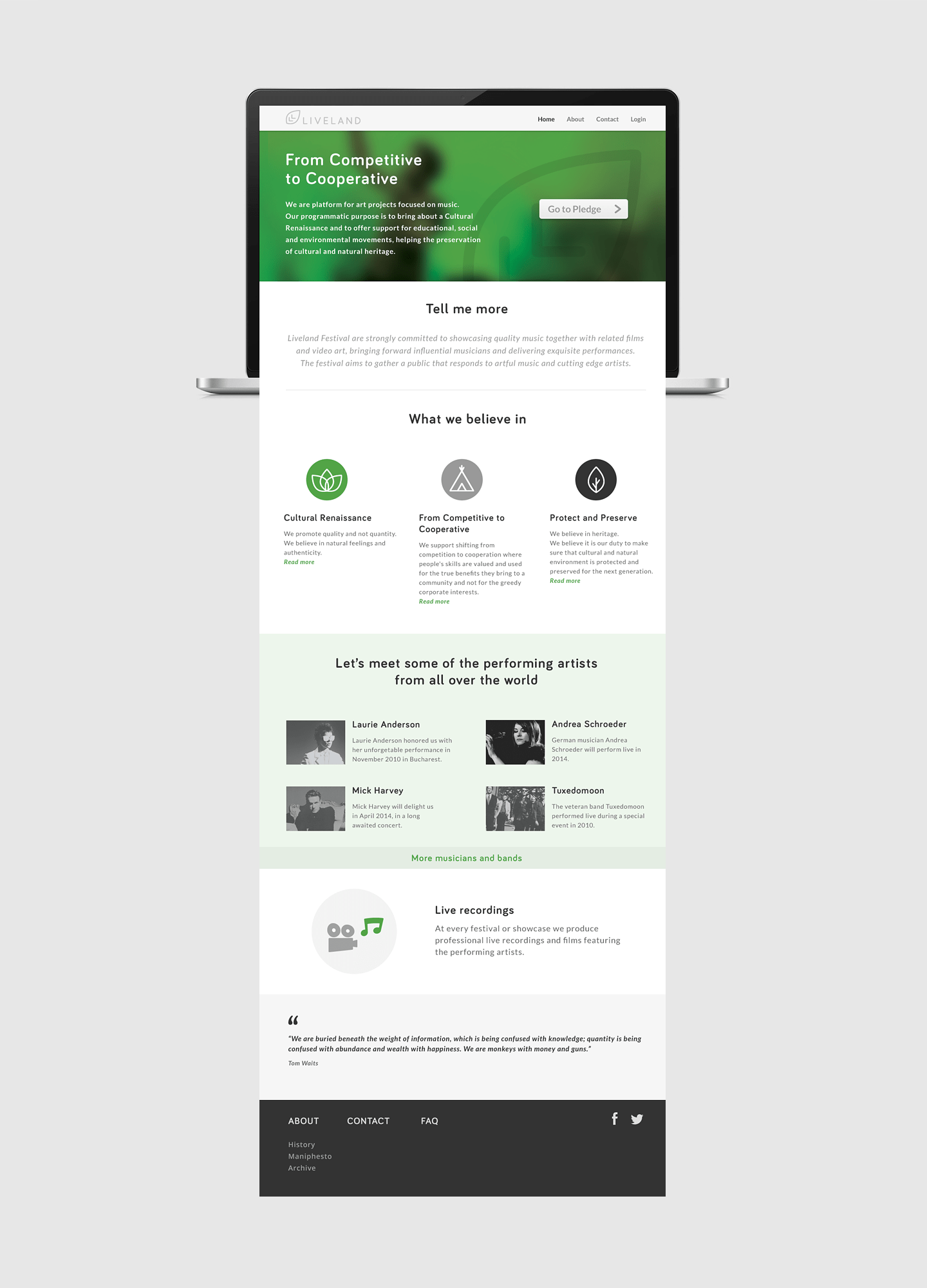 Liveland is a platform for art projects focused on music aiming for cultural revival and sustainability and also offering support for educational, social and environmental movements. The platform which launched in 2010 under a different design decided for an updated visual identity with a minimalistic approach. The original leaf was reinterpreted and the ‘L’ initials were integrated into its final graphic shape, strongly emphasizing the concept of Liveland.